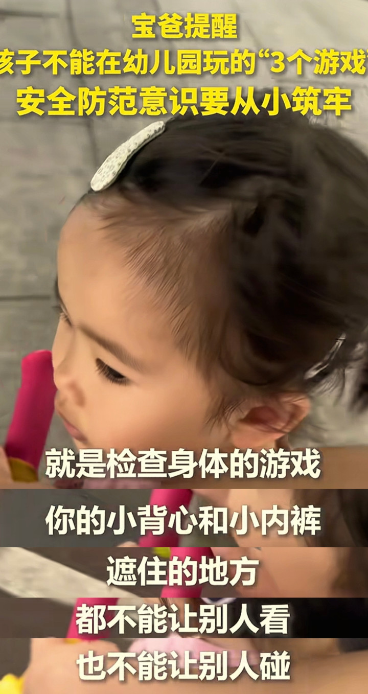 这个其实是要教会孩子自我保护,爸爸就叮嘱自己的女儿在幼儿园睡觉的时候,背心和小内裤遮住的地方千万不能给别人看,也不能给别人摸,甚至不能跟别人一起讨论。